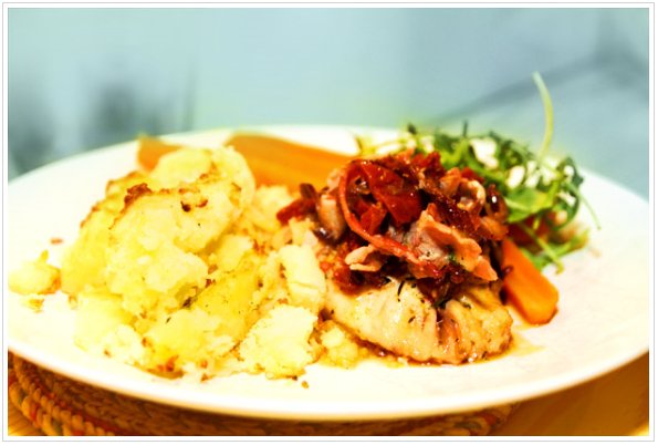 2. Tag en ugnsfast form och ringla ut smör och rör ihop med sambal oelek och pressad vitlök med salt och peppar. Lägg fiskbitarna på smöret, klipp persilja över och salta och peppra. Lägg baconröran ovanpå fisken och ställ in i 200° i ca 15 minuter. Tag ut efter halva tiden och ös fisken med smöret.
