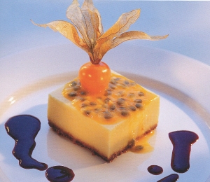 10. Skär moussen i fina bitar och servera med passionsfrukt, physalis och bärsåsen.